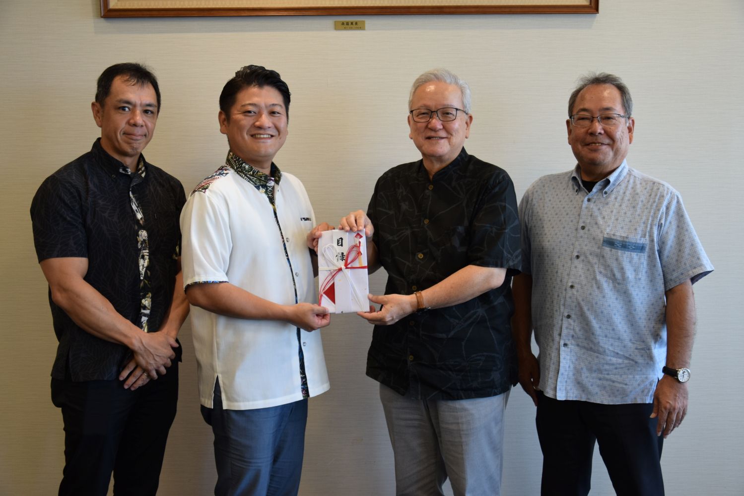 武富和彦代表(右から2人目)に目録を手渡す中部興産の新垣貴雪社長(同3人目)と比嘉優貴専務(左)、兼城賢順常務