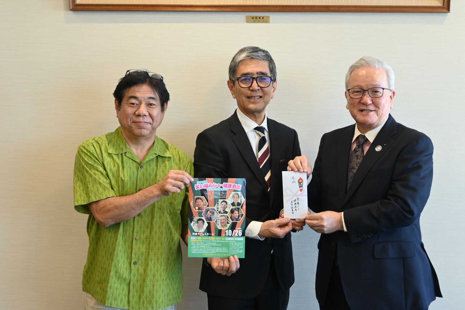 うちな~噺家(はなしか)の藤木志ぃさー(藤木勇人)さんとラジオ沖縄パーソナリティーの森田明(沖な家三語笑)さんより寄付金15万円を賜りました。昨年10月に開いた「第14回笑い福らしゃ・健康寄席」の収益金を充てたとのこと。寄付は今回で8回目で累計192万3千円。